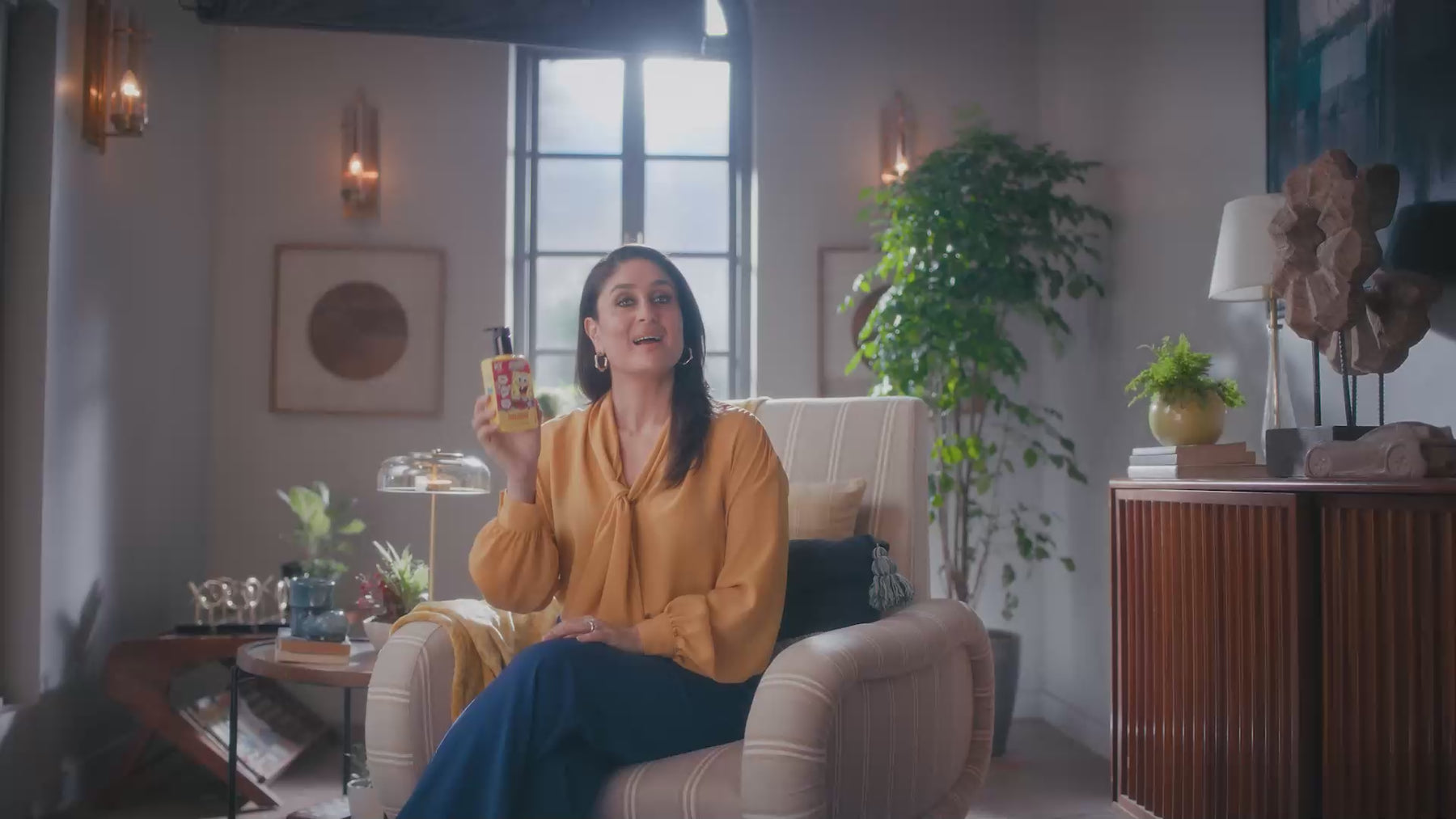 Gentle cleansing shampoo for girls displayed by a smiling woman in a colorful shirt, promoting fun bath time.